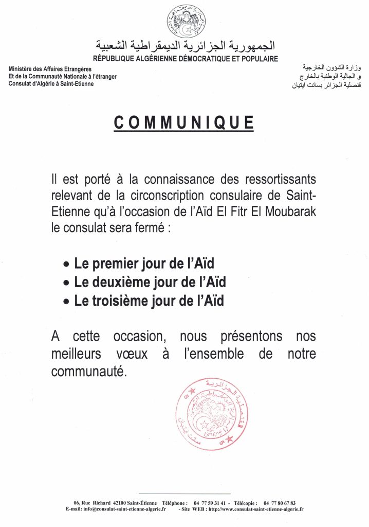 Bienvenue au Consulat d’Algérie à Saint-Etienne Nos bureaux sont ouverts du MARDI au SAMEDI de 8h30 à 15h00